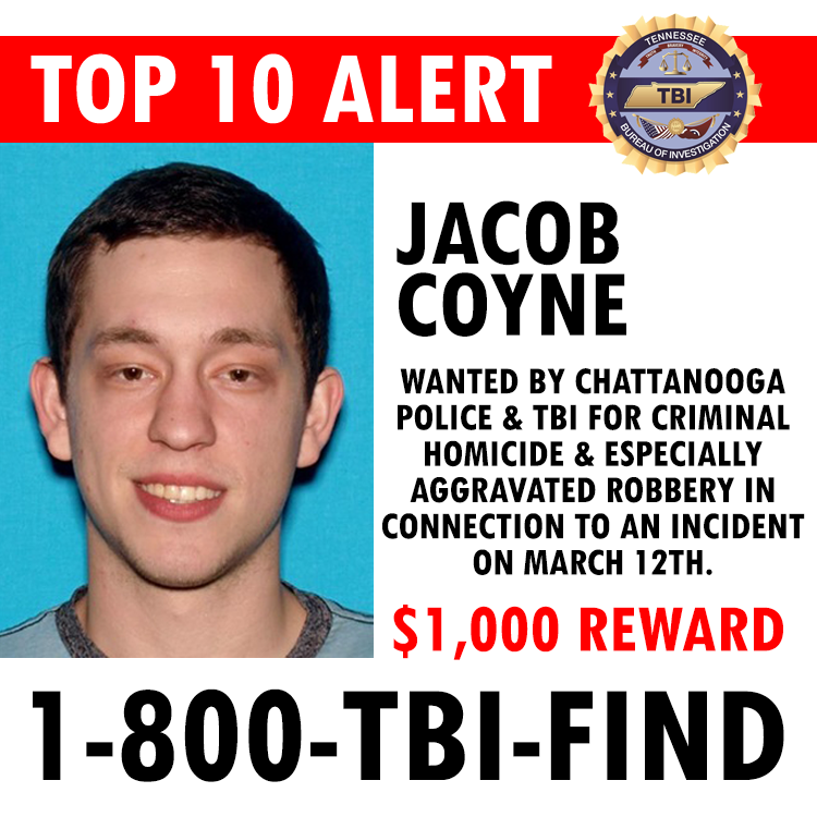 Coyne (DOB 10-5-95) is wanted by the Chattanooga Police Department and the Tennessee Bureau of Investigation to face charges of Criminal Homicide and Especially Aggravated Robbery in connection to an incident that occurred on March 12th in Chattanooga. He may be in the area of Hamilton County or North Georgia and should be considered armed and dangerous.