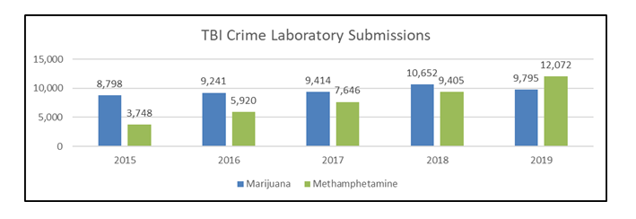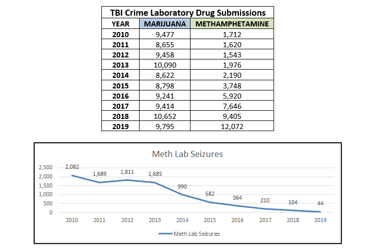 NASHVILLE – For the first time since the TBI crime laboratories began keeping detailed statistics, methamphetamine eclipsed marijuana as the most-submitted drug in the state in 2019.